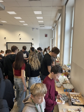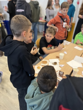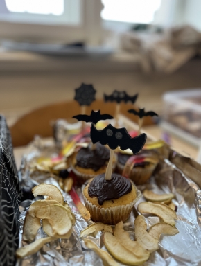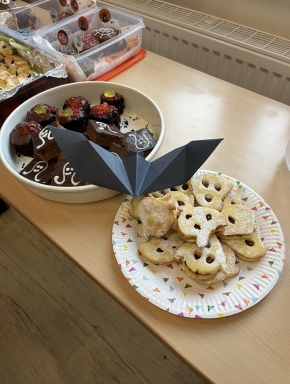 Třída prima a první ročník sportovců připravily pro celou školu halloweenskou snídani, která probíhala opět společně v prostorách školní auly. Studenti napekli spoustu tematických dobrot – od strašidelných muffinů až po dýňové speciality, které ozdobily společný stůl.