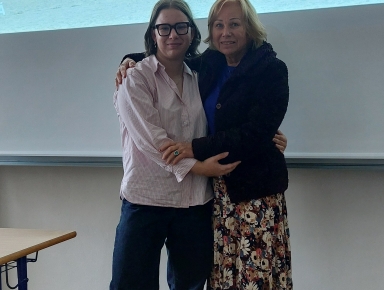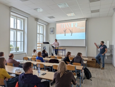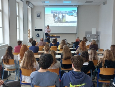 Dne 22. 10. 2025 proběhla v prostorách naší auly první cestovatelská přednáška, která se tak stala pilotním počinem pravidelného cestovatelského setkávání na České, které se věnuje sdílení zážitků z cest žáků, vyučujících a přátel školy. Tato inspirativní setkání jsou přístupná i veřejnosti a kdokoliv si tak může přijít poslechnout poutavé vyprávění z cest. Na první cestovatelskou přednášku se nám přihlásila žákyně třídy 3.A Anna Pěkná, která velkou část svého volného času věnuje cestování a na svém seznamu navštívených zemí má již označenou celou řadu zemí napříč celým světem. Pro tuto cestovatelskou hodinku na České si Anička připravila povídání o její nedávné dobrodružné cestě do Namibie. Posluchači tak mohli nasát atmosféru tamní divočiny a na autentických fotografiích obdivovat krásy zdejší krajiny. Nedílnou součástí byla také ochutnávka sušeného masa přivezeného přímo z Namibie. Toto zajímavé vypravování přivedlo do prostor auly celou řadu žáků a vyučujících napříč celou školou, stejně tak v publiku seděla Aničky babička, která velkou část těchto dobrodružných cest absolvuje právě se svou vnučkou.
