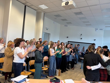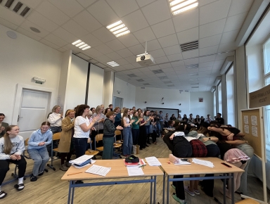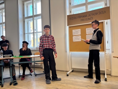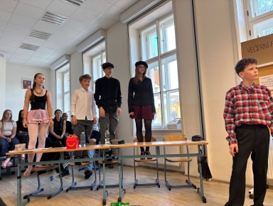 O velké přestávce se v aule znovu sešli vyučující, pro něž si 3. E se svou třídní učitelkou H. Novotnou u příležitosti Dne učitelů připravila představení Shakespeare, k tabuli! Tato dramatizace vznikla na motivy knihy L. Rostena Pan Kaplan má třídu rád. Všichni se skvěle bavili a herce z tercie odměnili dlouhým potleskem. Jak nám řekla paní učitelka Radka Hrubešová: „Původně jsem chtěla opravovat písemky, ale tomuhle vystoupení prostě nešlo odolat. Klidně bych se dívala i hodinu!“